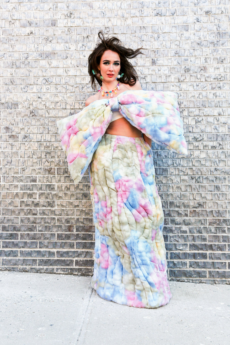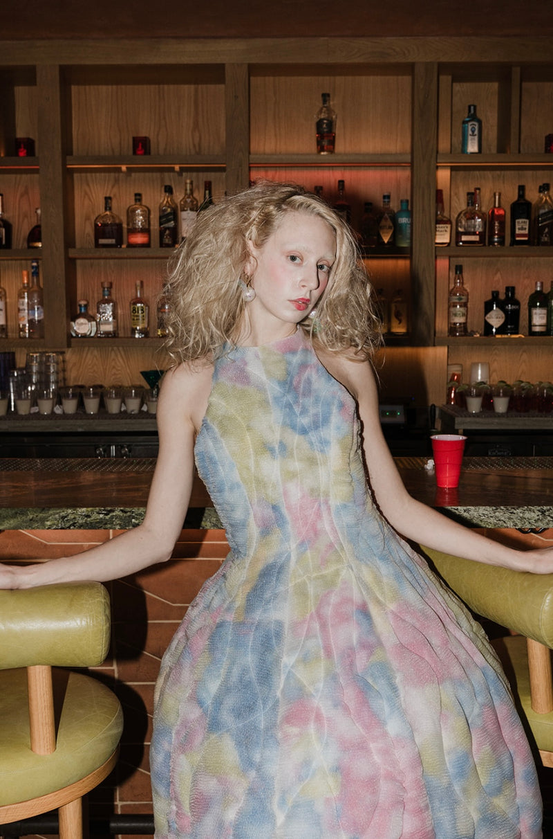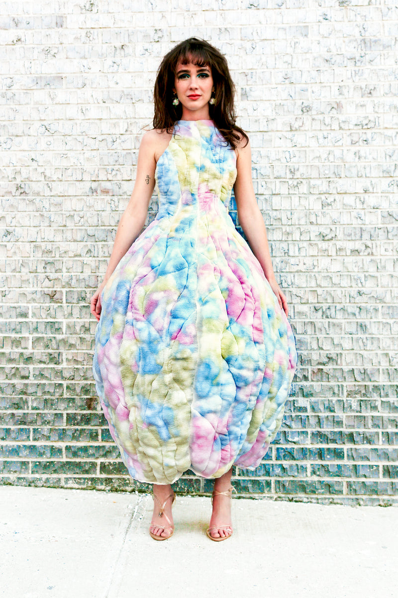 Handcrafted in New York, these sculptural garments explore childlike playfulness layered with hidden depth. Each piece is produced on a made-to-order basis, requiring extensive handwork and unique fabric treatments.