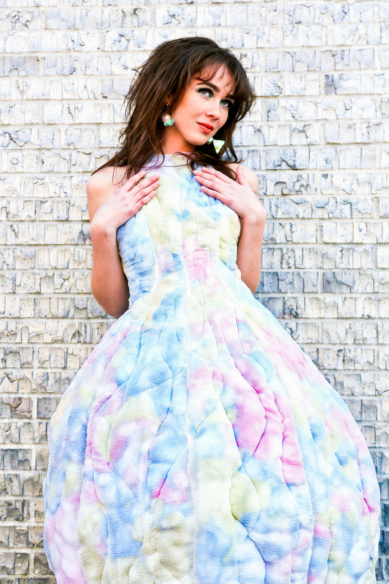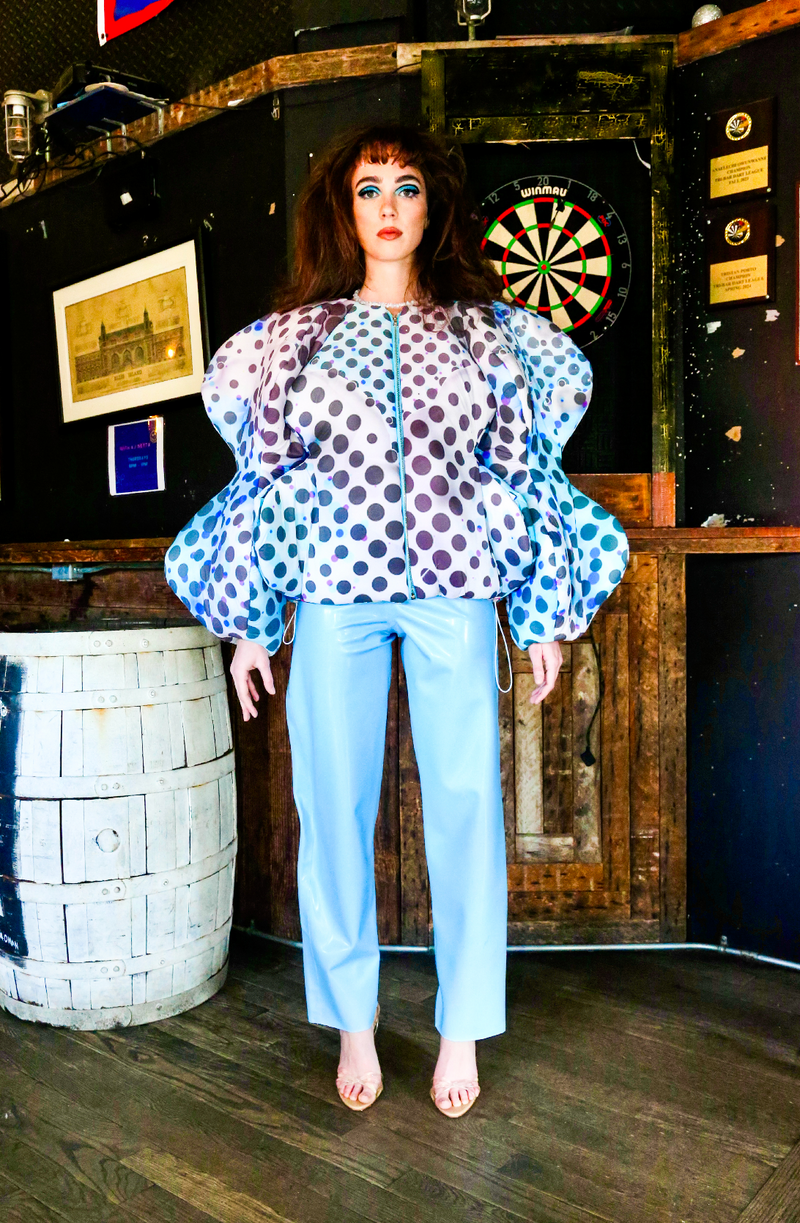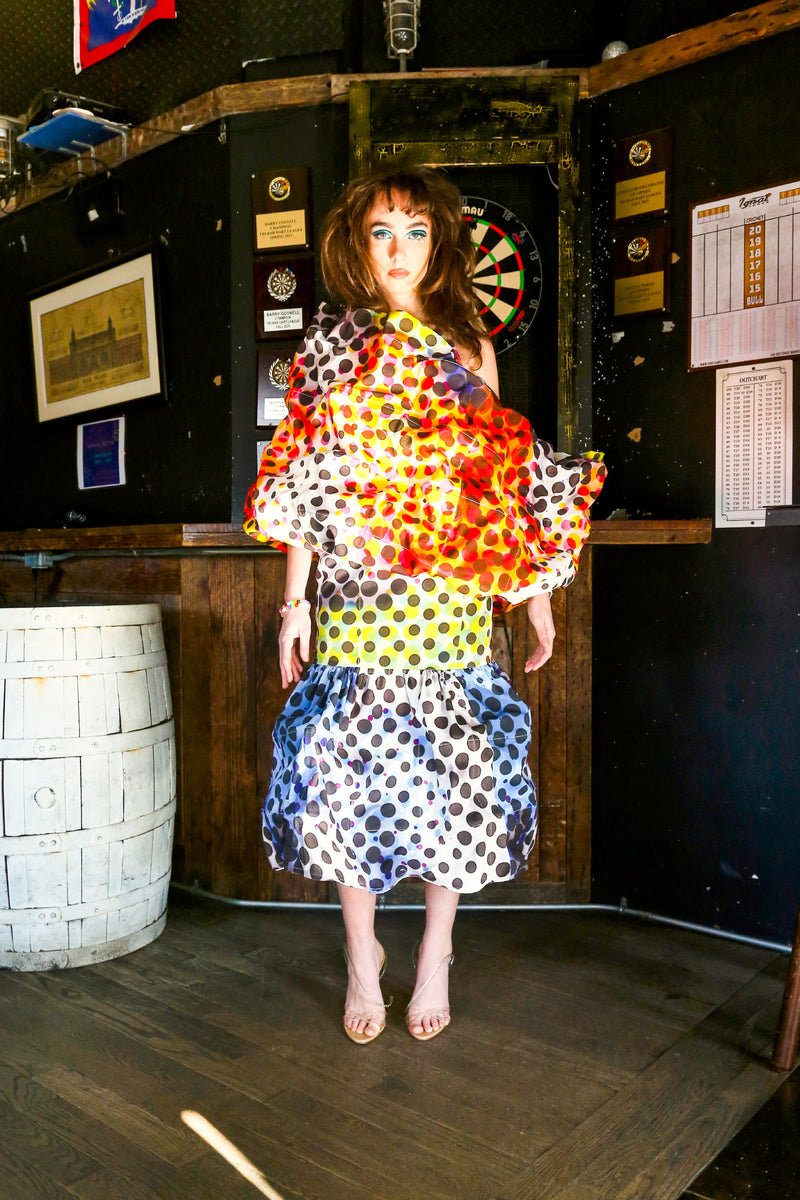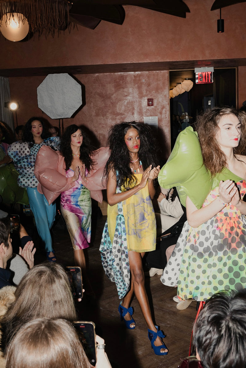 Handcrafted in New York, these sculptural garments explore childlike playfulness layered with hidden depth. Each piece is produced on a made-to-order basis, requiring extensive handwork and unique fabric treatments.
